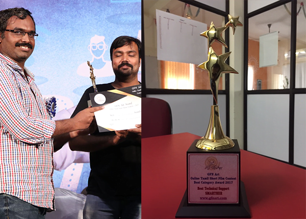 Smarther is a leading Mobile App and website development company in Chennai India, has honoured as Best Tecchnical Support by GFNArt Awards, Tamil Short movie online contest.